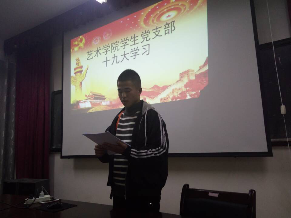 2017年11月21日晚7点,艺术学院学生支部书记蔡跃老师组织艺术学院全体学生入党积极将分子、发展对象、预备党员在艺术楼二楼会议室举行“学习党的十九大精神”宣讲活动。