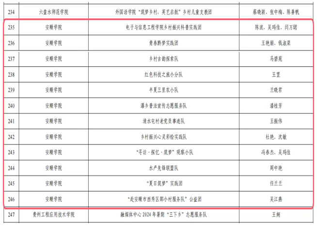 近日,中共贵州省委宣传部等部门联合印发《关于公布2024年贵州省大学生暑期文化科技卫生“三下乡”社会实践活动评审结果的通报》,我校青年积极投身实践,表现突出,荣获优秀实践单位4个、优秀实践团队12个、优秀个人12名。
