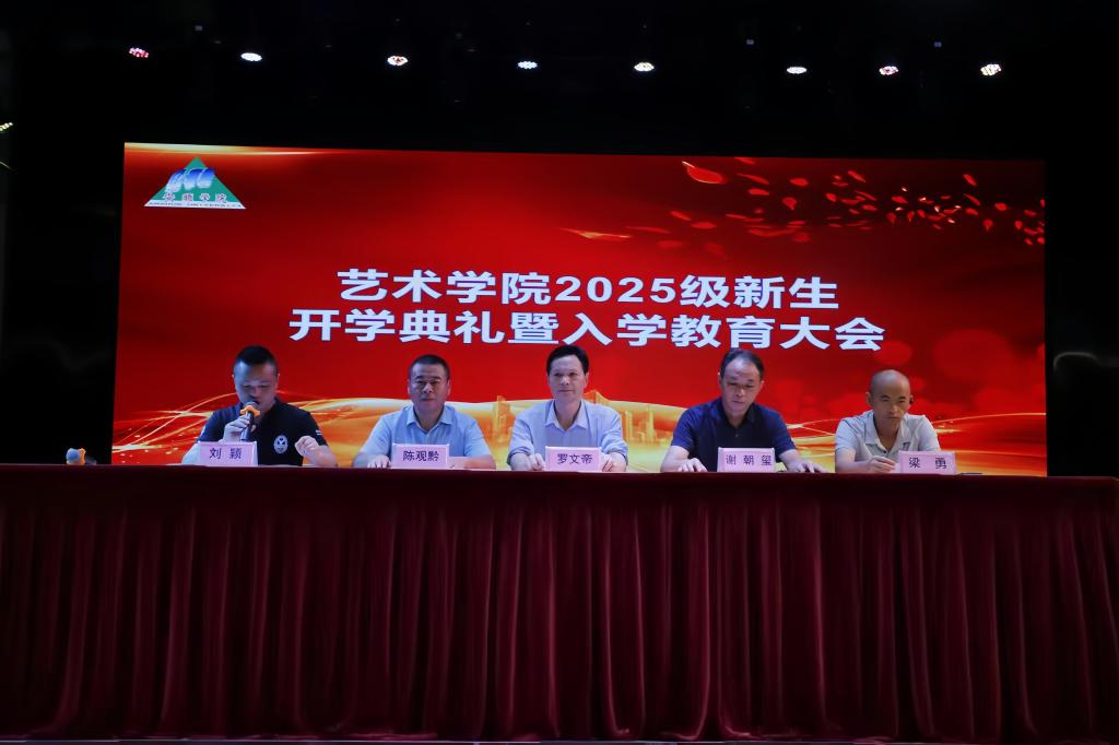 9月5日下午,艺术学院2025级新生开学典礼暨入学教育大会在学校大礼堂隆重举行。院党委书记陈观黔、院长罗文帝、副院长谢朝玺、院党委专职副书记刘颖、副院长梁勇出席,各科室负责人、辅导员、新生班班主任以及2025级全体新生参加典礼。典礼由刘颖主持。典礼在庄严的国歌声中拉开帷幕。